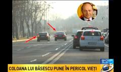 Potrivit imaginilor difuzate, se vede cum mașina din coloana lui Băsescu trece de linia dublă continuă sau merge pe contrasens.